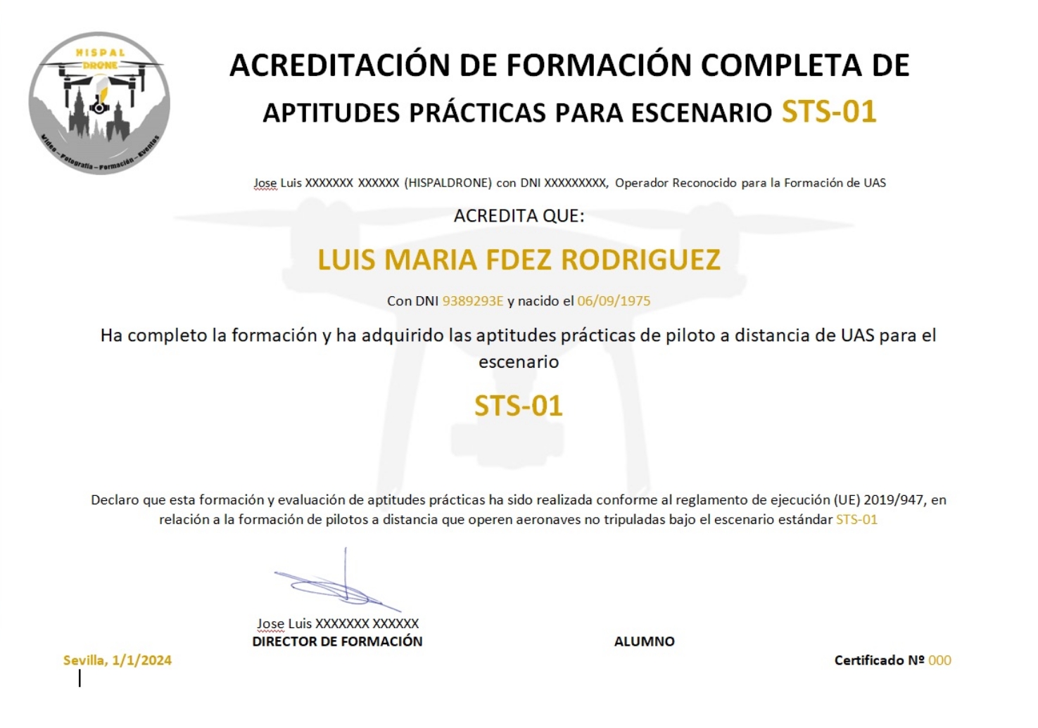 La formación STS conlleva además del certificado teórico realizado en la web de AESA, una formación práctica en modo evaluación continua donde el piloto deberá demostrar sus capacidades en un campo de vuelo real sobre un entorno representativo del escenario en el que se esté formando.